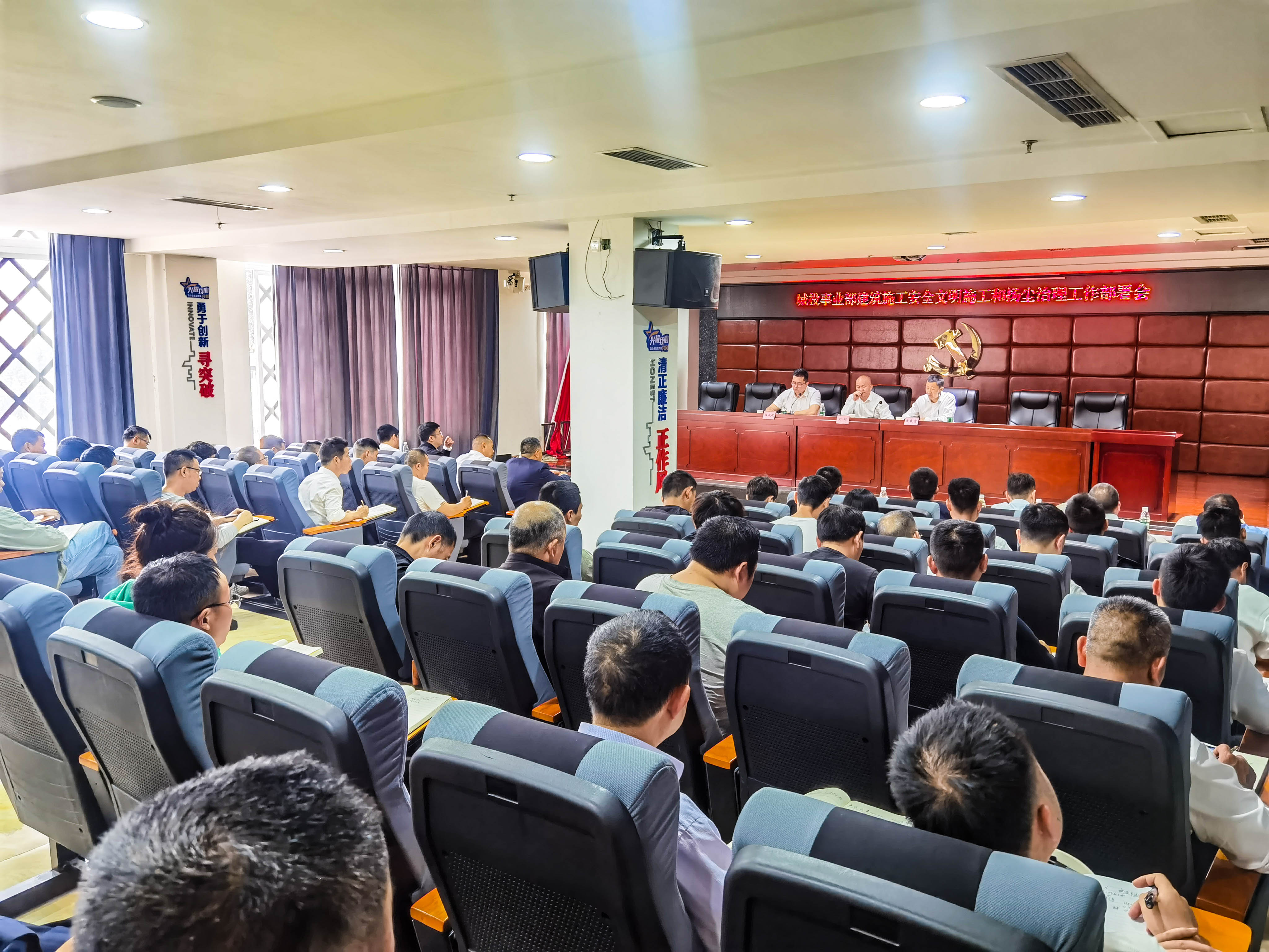 觀摩結(jié)束后召開建筑施工安全文明施工和揚塵治理工作部署會。會上,城投事業(yè)部各公司負(fù)責(zé)人作交流發(fā)言。劉總肯定了近年來公司在項目管理工作中取得的成績,分析了當(dāng)前形勢下項目管理面臨的挑戰(zhàn),并指出項目管理過程中需要高度關(guān)注的突出問題,對下步工作作安排部署。